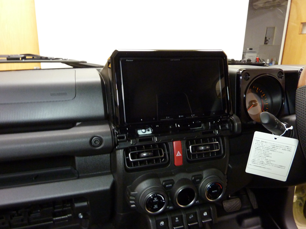 ナビは9インチのAVIC-RQ822、フロントスピーカーはジムニー用の専用パーツを使用し、TS-C1640Sを取り付け。