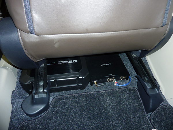 DSPプロセッサーはカロッツェリアのDEQ-200Aをサブウーファーと一緒に助手席シート下に取り付け。